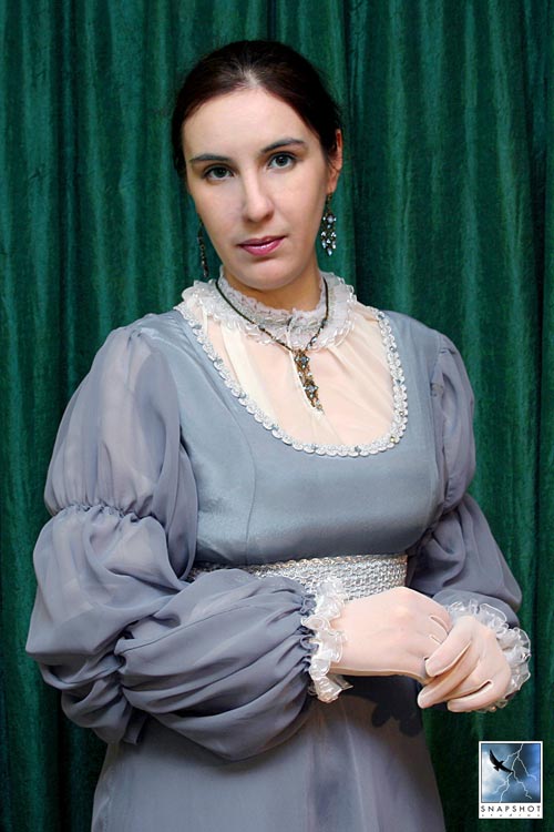 ![]() | Игровой проект "Золотой век" (Россия, 19. в.) Дневное платье княжны Марии Чарторыйской. Ампир, стилизация. В соответствии с характерным для ампира кроем платье отличается сильно завышенной талией, но для верха использована выкройка шестиклинного современного платья. Юбка двуслойная, клешеная, скроена по косой, нижнее полотнище из креп-атласа расшито стразами. Рукава двойные - верх из серого шифона, второй слой - из кремового капрона в тон шемизетки. Материалы: креп-атлас, шифон, капрон. Отделка: тесьма, рюши, стразы. Автор идеи, пошив костюма, модель: Марго. | ![]() |