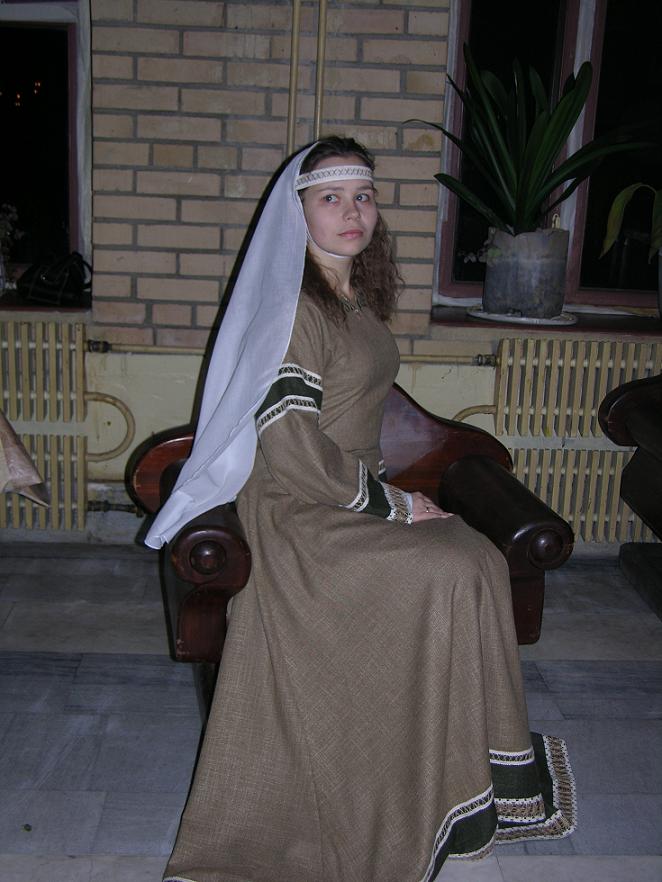 Парные костюмы, пошитые для первой годовщины свадьбы. Невеста. Стилизация под 12й век, лен с вискозой, льняная тесьма в два цвета. Фотографии репортажные.