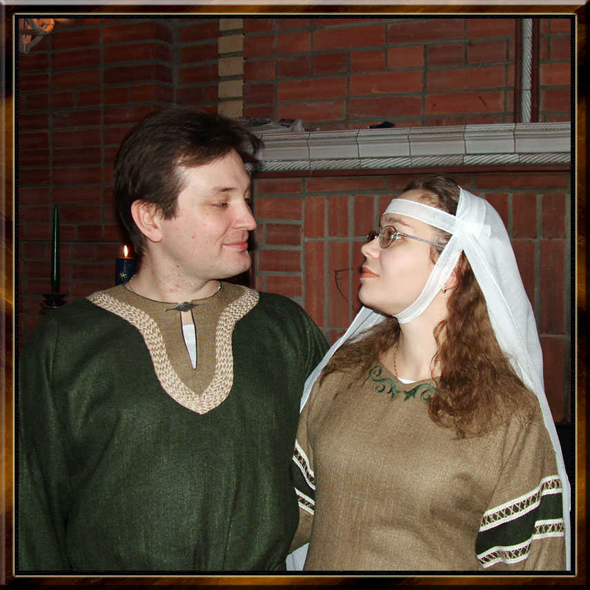 Парные костюмы, пошитые для первой годовщины свадьбы. Молодожены. Стилизация под 12й век, лен с вискозой, льняная тесьма в два цвета. Фотографии репортажные.