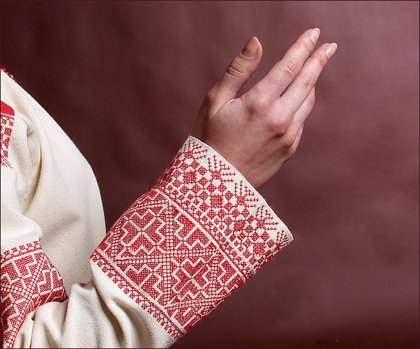 Рубаха от русского женского костюма. Вышивка. Отделка -- контрастные полики, машинная вышивка крестом, ткачество на бердышке. Модель -- Любовь Берлянская, фото -- Алексей Барский, литьe -- Иван "Йон" (г.Москва).
