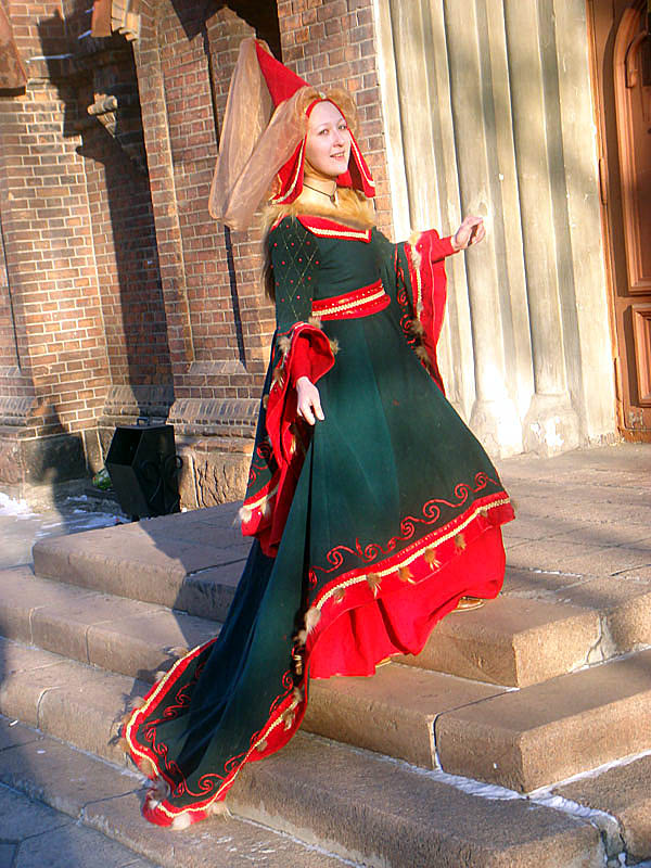 ![]() | Графиня Маргарет Тюдор. Цветовая гамма костюма соответствует гербу Тюдоров - красный дракон на бело-зеленом фоне. Женский костюм: киртл, роб (шлейф, декоративные рукава), пояс, головной убор - остроконечный эннен. Отделка - лисий мех, расшит атласным шнуром, бусинами, атласными лентами. | |