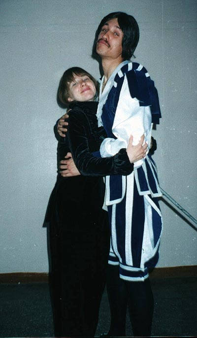 ![]() | 29.05.99, игра "Королева Марго". Граф де Муи (Андрей Ляндзберг /Дэл) и его возлюбленная графиня де Гиз (отсутствующая в книге Дюма сестра герцога Генриха де Гиза, Ирина Жердочкина / Элбре). Кстати, у меня (у Дэла)на голове парик, чтоб вы знали. :-)) | |