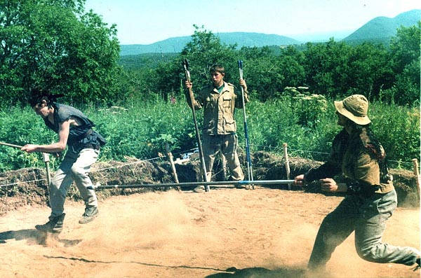 ![]() | там же, тогда же. Бой на копьях. Исполняют Николай Володько /Маблунг (слева) и Александр Ивашечкин / Валуа (справа). Уникальный кадр: Мабл после пропущенного удара аж подпрыгнул, бедный, и, обратите внимание, в данный момент висит в воздухе. :-)) | ![]() |