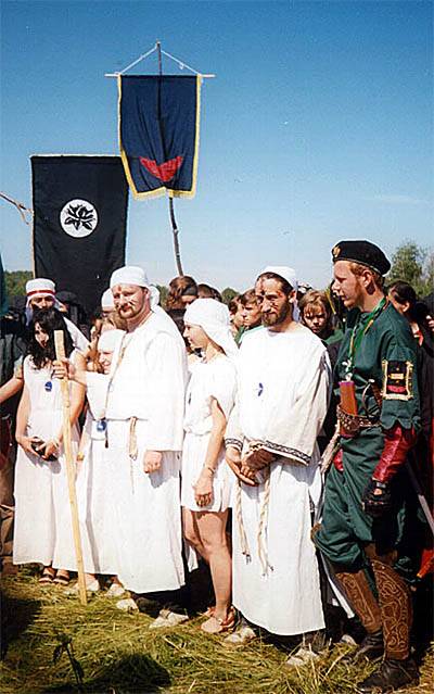 ![]() | К'он Делор - плясуновский тандем на параде. В зеленом Пустынный Лис (Фокс). В белом - жрецы бога Делора. Слева направо Ольга Черненькая, Хэппи, Руся, Мета, Командор. Видны штандарты Черных Лотосов и Улыбки Бога. | ![]() |