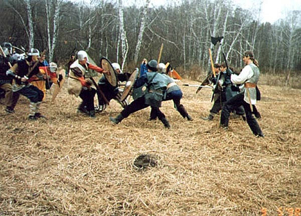 ![]() | Бой англосаксов против норвежских викингов. Сходятся король Альфред (Ермолаев) и Ярл Черный Дракон (Миша Бражников). (фото через 1 секунду) | ![]() |