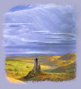 Княжество Кардолан "Они услышали о великих Могильниках и зеленых холмах, увенчанных коронами из зазубренных камней, и тайных пещерах. Блеяли овцы. Воздвигались высокие стены, образуя могучие многобашенные твердыни; их владыки яростно враждовали друг с другом, и юное солнце багрово блистало на жаждущих крови клинках. Победы сменялись разгромами, с грохотом рушились горделивые замки, и плямя взлетало в небеса. Золото осыпало усыпальницы мертвых царей, смыкались каменные своды, а над прахом поверженных царств вырастала густая трава. С востока приходили пастухи, и снова блеяли над гробницами овцы... Из далекого далека надвигалась необоримая Тьма, и кости хрустели в могилах. Умертвия бродили по пещерам, вторя завываниям ветра мертвым звоном золотых ожерелий. А каменные короны на безмолвных холмах осклаблялись, щерились в лунном свете, как обломанные белые зубы". |