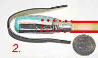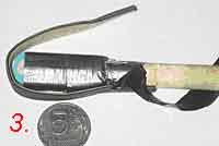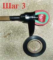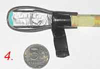 Примечание. Опытным путем выяснено, что такой рецепт наконечника удобен для луков мощностью до 13 кг. При большей мощности (13-15 кг.) древко стрелы начинает проминаться о стальную монетку и приходится (на шаге 1) дополнительно наматывать толстую муфту из изоленты из 10-15 оборотов на древко у основания монеты.