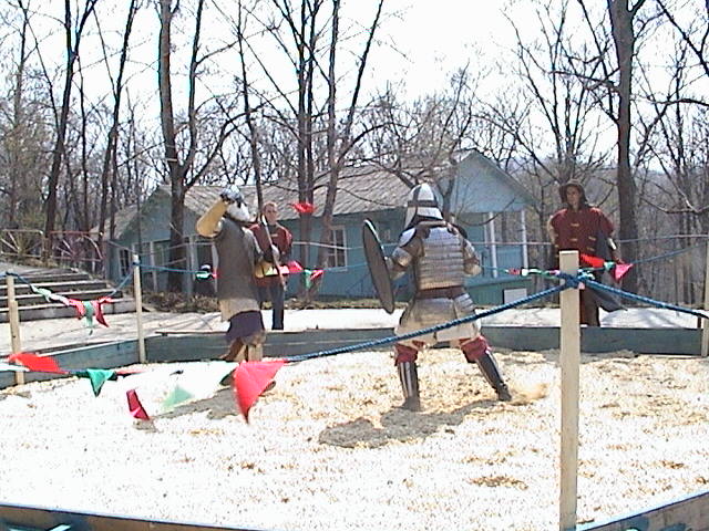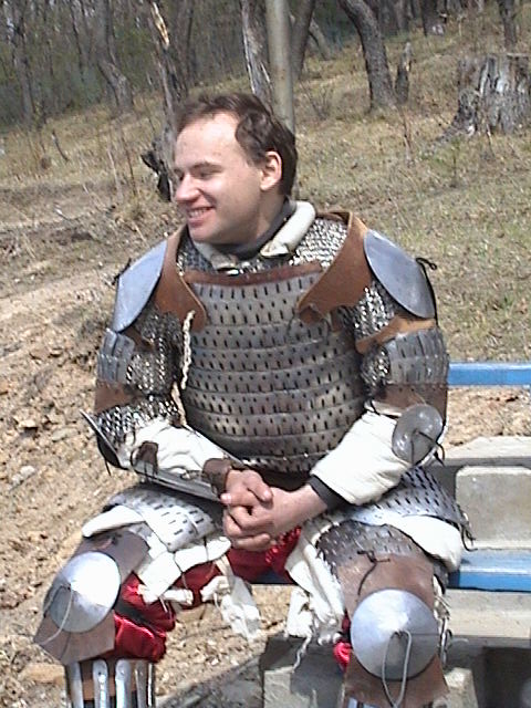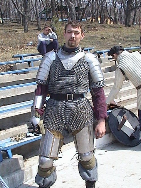 Настроение в тот день у всех было боевое. Погода стояла хорошая. К одиннадцати часам бойцы напялив доспехи начали подтягиваться к турнирному кругу. Надо сказать что некоторые элементы доспехов оставляли желать т лучшего и далеко не только у меня. Чего только стоил творение рук человеческих под названием дерьмошлем обыкновенный ( простите ради бога, но уж так его все называли), крашенный прямо по недобитой свой ржавчине краской белой, подоконной J , хотя по большей части экипировка вызывала если не восхищение, то хотя бы уважение. Самым тяжелым доспехом из всех участников обладал господин Юранд которого остальные называли просто дядя Юра. Весило снаряжение 33 кило. И вообще Юранду мой респект ибо при его размерах и габаритах в соотношении с весом доспехов пробиться в полуфинал! Этого помоему не ожидал ни кто.