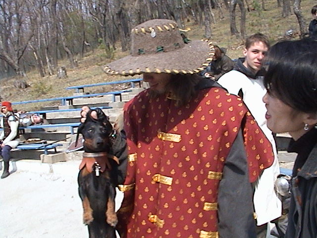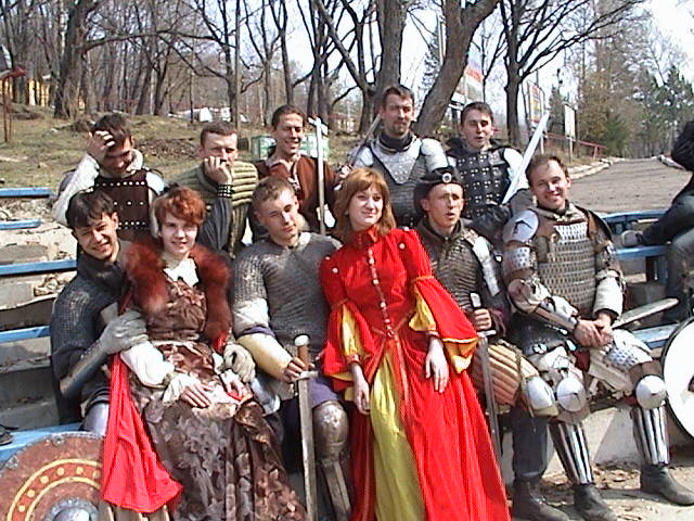 Про антураж и костюмы. Про доспехи вроде все сказано, но если интересно, то можно полюбоваться на бойцов на этой фоте скажем ( см ниже). Костюмы приехавших со мной дам Дарланы и Джеллы, был не в пример лучше костюмов хабаровчан, и вообще если честно, плохо в Хабаровске с костюмами J Первую часть турнира Джелла была в моем платье по причине холода, вторую уже в своем. Стоит особо отметить Хабаровские клинки. Легкие и прочные , они у любого вызвали бы восхищение.