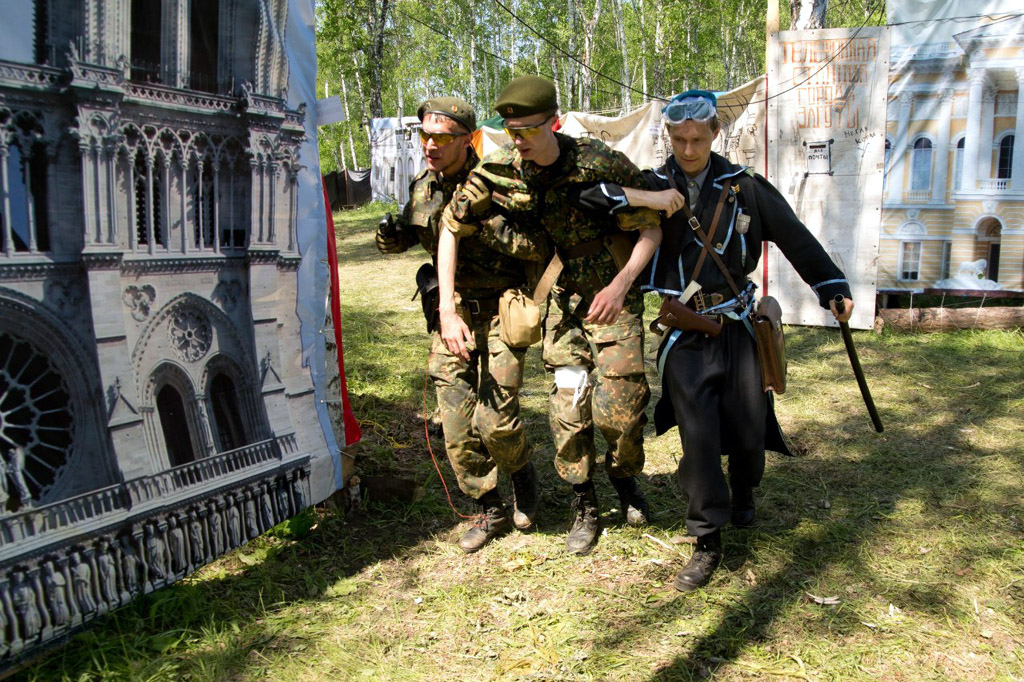 ![]() | Бойцы несут раненого товарища с поля боя | ![]() |